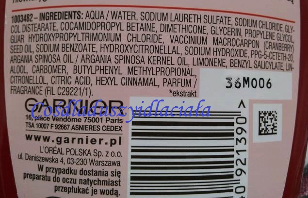 Zapach obłędny, żurawinowy, który utrzymuje się długo, nawet bardzo długo, jeśli myje włosy wieczorem, zapach czuć jeszcze rano i przez cały dzień. Nie jest mocno drażniący, no chyba, że nie lubicie tego zapachu lub boli Was głowa....